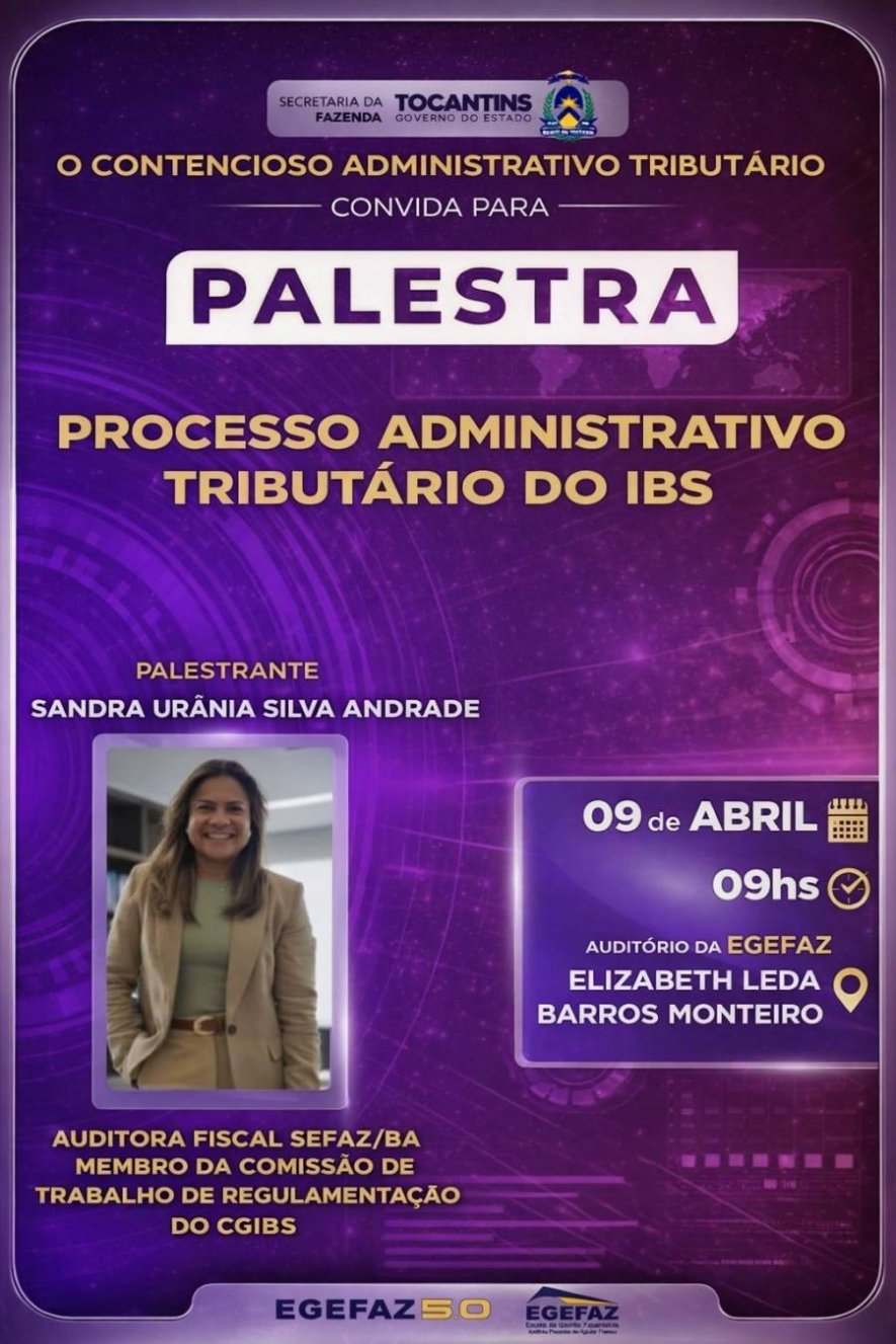 O evento acontecerá no Auditório da EGEFAZ Elizabeth Leda Barros Monteiro e terá como palestrante a auditora fiscal Sandra Urânia Silva Andrade, da SEFAZ da Bahia, integrante da Comissão de Trabalho de Regulamentação do CGIBS.